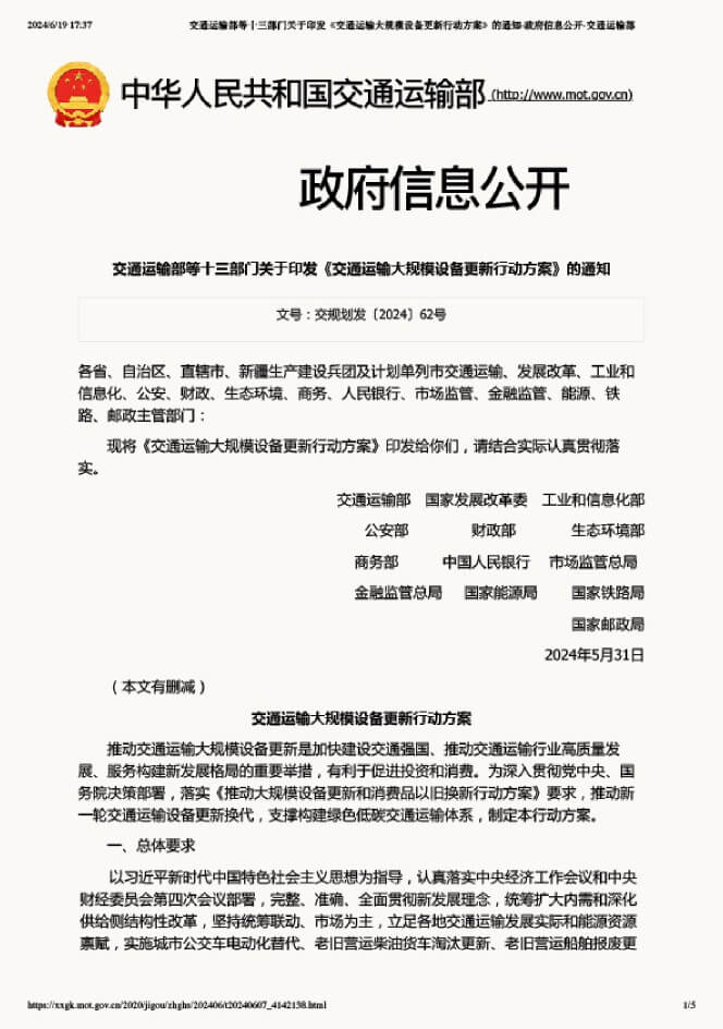 交通运输部等十三部门关于印发《交通运输大规模设备更新行动方案》的通知