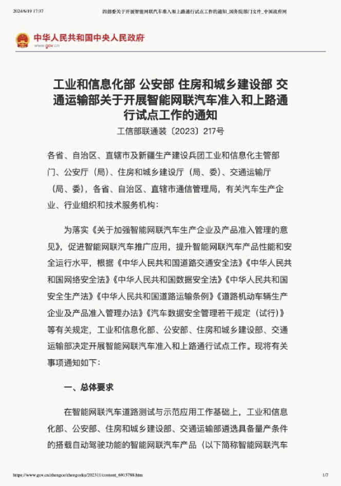 工信部、公安部、住建部、交通运输部关于开展智能网联汽车准入和上路通行试点工作的通知