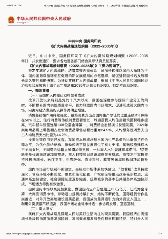 中共中央、国务院印发《扩大内需战略规划纲要(2022-2035年)》