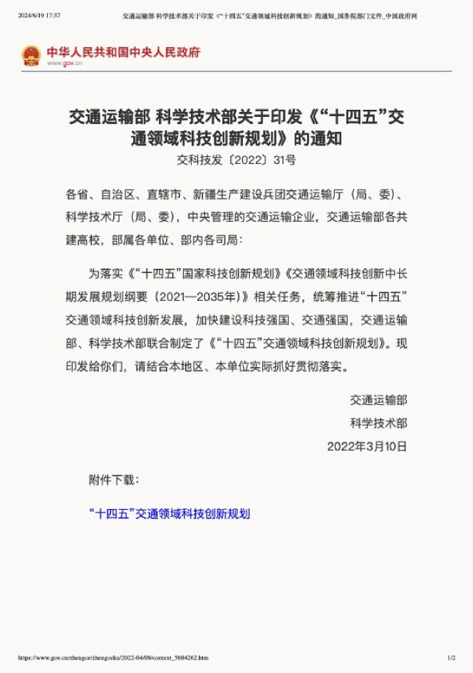 交通运输部、科学技术部关于印发《“十四五”交通领域科技创新规划》的通知